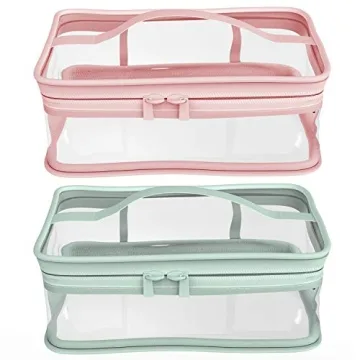 Show moreIntroducing the ultimate solution for organized beauty on-the-go: this elegant set of 2 cosmetic bags, one in a charming pink and the other in a fresh green hue. These bags are made from resilient, waterproof PVC material, ensuring they not only look great but are also built to last. Measuring at 8.3 x 5.9 x 3.5 inches, these perfectly sized pouches are ideal for carrying all your essential cosmetics, toiletries, and small accessories. The transparent design sets these bags apart, allowing you to find what you need without rummaging around, saving you time especially when traveling or in a rush.