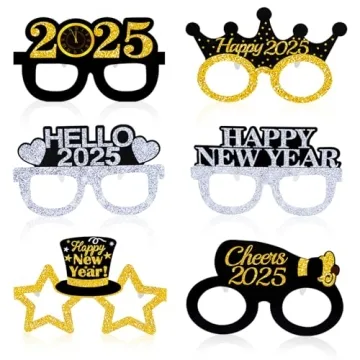 Show moreCelebrate the arrival of 2025 in style with the Malhaii 12Pcs Happy New Year Eyeglasses Decorations. These charming party eyeglasses come in a versatile pack of 12, featuring six distinct designs that seamlessly match festive decorations. Each pair showcases unique phrases such as "Cheers 2025", "Happy New Year", and "Hello 2025", all rendered in a classy gold, silver, and black color scheme. Ideal for both adults and kids, these glasses not only enhance the party vibe but also serve as wonderful photo booth props, ensuring that everyone captures the joyous moments of the celebration.
