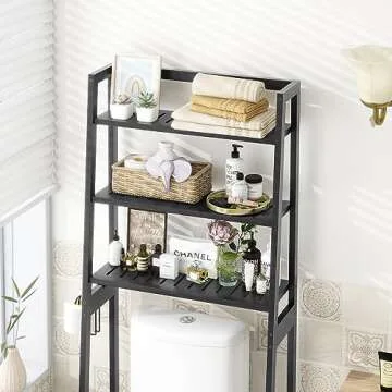 MallKing Over The Toilet Storage, Wooden 3-Tier Over-The-Toilet Rack Bathroom Space Saver Organizer, Freestanding Above Toilet with Toilet Paper Holder and Hooks (Black)