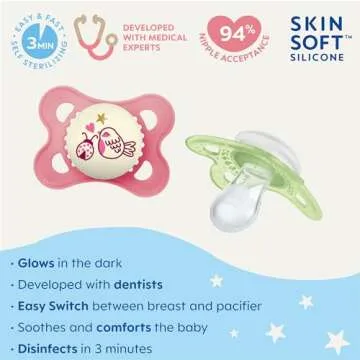 The MAM Glow-in-the-Dark Pacifier is not only durable but also incredibly soft and flexible, designed to adapt perfectly to your baby’s mouth. An impressive 94% of babies approve this pacifier, underscoring its popularity and effectiveness. With various cute colors available, it’s not just practical but also stylish, making it a favorite choice among parents and children alike.