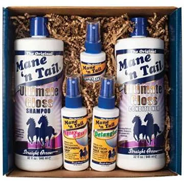 Show moreIntroducing the Mane 'n Tail Ultimate Gloss Shampoo and Conditioner Set, designed for those who seek remarkable shine and healthy hair. This all-in-one 32oz set includes both the Ultimate Gloss Shampoo and Conditioner, delivering professional-grade care to your hair that you can achieve at home. The unique formula combines the cleansing and moisturizing properties needed to revitalize and enhance your hair's natural beauty with a glossy finish. Along with this, you’ll receive a handy 4oz of the Detangler Spray, perfect for smoothing out knots, and a 4oz of Spray 'n White to brighten your coat, as well as Spray 'n Braid for easy handling during grooming. Experience the difference in lustrous hair with the power of Mane 'n Tail.