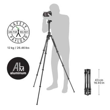 It features a lightweight aluminum build, a 90-degree column mechanism for versatile positioning, and a Centre Ball Head for precise adjustments.