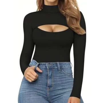 MANGOPOP Black Bodysuit Mock Neck Cutout Front Long Sleeve Tops(Black S)