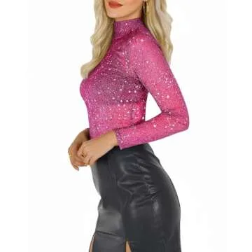 MANGOPOP Glitter Sheer Mesh Top Women Long Sleeve Sexy Shirt See Through Clubwear Tee Slim Blouse