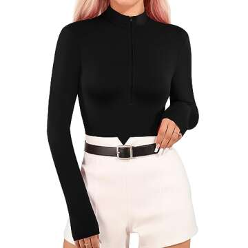 MANGOPOP Long Sleeve Body Suit Mock Turtle Neck Fleece lined Zip Up Bodysuit for Women Ribbed Deep V Sexy Bodysuit Shirts