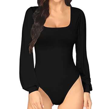MANGOPOP Square Neck Puff Sleeve Bodysuit Loose Lantern Long Sleeve Body Suit for Women for Going Out