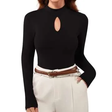 MANGOPOP Women's Black Long Sleeve Bodysuit Mock Neck Sexy Keyhole Front Shirt Tops