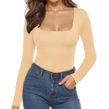 MANGOPOP Women's Bodysuit Square Neck Long Sleeve Slim Fitted Tops (Nude, Small)