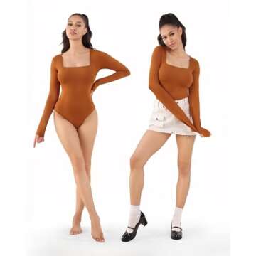 MANGOPOP Women's Bodysuits Long Sleeve Square Neck Slim Fitted Tops (Camel, Medium)
