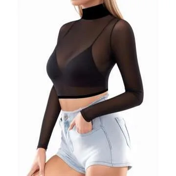 MANGOPOP Women's Short Sleeve Long Sleeve Sheer Mesh Crop Tops Tee Shirt Blouse