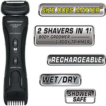 Show moreExperience the ultimate in personal grooming with the MANGROOMER Lithium Max Plus Body Groomer! This innovative product seamlessly combines two essential grooming tools into one powerful device, making it an essential companion for anyone seeking unparalleled comfort and convenience in body grooming. Designed for modern gentlemen who appreciate functionality and style, the MANGROOMER is perfect for grooming all areas of the body— from underarms to groin, shoulders to legs. With its cutting-edge design, you'll no longer have to juggle multiple grooming tools, ensuring you always look sharp and well-groomed.