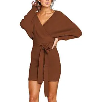 Mansy Women's Sexy Cocktail Batwing Long Sleeve Backless Mock Wrap Knit Sweater Mini Dress Brown