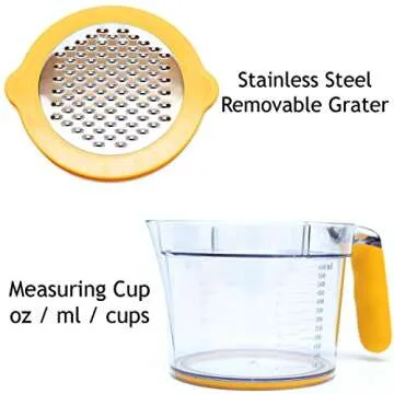 Introducing the ultimate kitchen companion that blends functionality and style: the Manual Citrus Juicer Measuring Cup with Grater and Egg Separator. This multi-functional kitchen tool is designed to simplify your cooking experience, making juicing, measuring, and grating a breeze. Crafted with durability in mind, this vibrant yellow juicer is not just a tool; it's an essential part of your culinary routine.