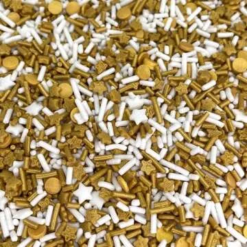 Show more Transform your celebrations with our delightful Gold and Silver Themed Sprinkles, specially crafted to bring joy and sweetness to your special moments! Each 4-ounce pack is filled with an irresistible mix of jimmies, nonpareils, sugar pearls, and confetti sprinkles that shine beautifully, creating a festive atmosphere that everyone will love. Whether decorating cakes, cupcakes, cookies, or pastries, these sprinkles are ideal for adding a pop of color and fun to all your desserts.