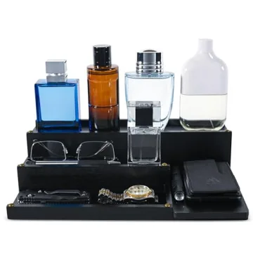 Show moreIntroducing the Manzano Essentials Wooden Cologne Stand Organizer—your ultimate solution for keeping your personal items beautifully organized and easily accessible. Crafted thoughtfully with 100% solid bamboo, this stylish cologne display stand not only serves as a practical accessory for your dresser but also as a striking piece of decor. With its sleek black finish, the organizer seamlessly fits into any bedroom or bathroom setup, adding a touch of elegance while reducing clutter. Designed to hold your 8 cologne bottles with additional space for more, the stand makes it easy to store everything from perfumes to wallets and watches in one convenient place.