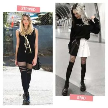 MANZI Faux Thigh High Tights Mock Suspender Pantyhose Striped Goth Fishnets Pack of 2 Striped/Grid One Size