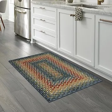 Show moreThe Maples Rugs Marion Braid Kitchen Rug is the perfect blend of timeless design and modern functionality, crafted with the utmost care by an experienced American manufacturer since 1966. This captivating accent area carpet features a stunning combination of soft shades of blue, green, rust, and gold that effortlessly add warmth and vibrancy to any kitchen décor. Its dimensions, measuring 2'6" x 3'10", make it a versatile choice suitable for various spaces, while the 0.38-inch pile height offers a low-profile design that is both stylish and practical for daily use.
