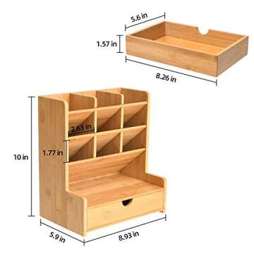 Show moreMake your workspace a beacon of organization and style with the Marbrasse Bamboo Pen Organizer! Crafted from 100% natural bamboo, this stunning desktop organizer brings functionality and elegance to your desk. Boasting an innovative three-layer design, it features nine angled tilt compartments that not only maximize storage efficiency but also ensure everything from pens to highlighters is easily accessible. The beautifully polished finish reveals the unique texture of the bamboo, adding a touch of sophistication to your workspace. Perfectly sized at 10.6 x 3.9 x 8.2 inches, this organizer is the epitome of practicality and aesthetic appeal.
