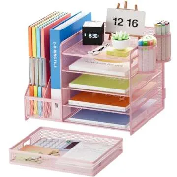 Show more The Marbrasse Desk Organizer with File Holder is the ultimate solution to transforming your cluttered workspace into an oasis of organization. Specifically designed for busy professionals, this chic and stylish organizer features 5 sliding trays, providing ample space to store your important papers, letters, and documents neatly. The unique pink color adds a pop of personality to your office decor, making it not just functional, but also fashionable. Additionally, it comes with 2 magazine holders and 2 hanging pencil holders, ensuring that every office supply has its dedicated place. What’s more, it includes a convenient sliding drawer where small accessories like paper clips or sticky notes can be stored effortlessly. At a perfect size of 13.8 x 11 x 12 inches, this organizer optimally utilizes vertical space while still being compact enough to fit any desk layout.