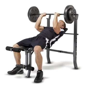 What truly sets this bench apart is its complete free-weight set, which includes a standard-size weight bar and a variety of weights (two 25 lbs, two 15 lbs, and two 10 lbs plates). Each weight plate is vinyl-coated for protection against damage, making it perfect for any home gym setup.