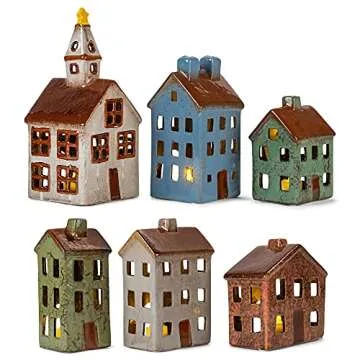 Mark Feldstein & Associates Village Houses and Church LED Tea Light Ceramic Stoneware Figurines 12 Piece Set