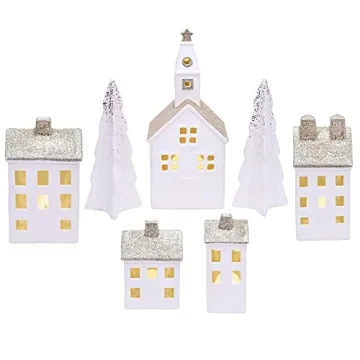 Step into a world of holiday enchantment with the Mark Feldstein & Associates Village White Glitter 9 Piece Set. This elegant collection features a beautifully crafted church and four charming cottages, complemented by four stunning trees, all highlighted with a delicate white glitter finish. Each piece is carefully made from durable porcelain ceramic, ensuring that your village retains its charm year after year while offering a **warm and inviting glow** through the built-in battery-operated LED tea lights....