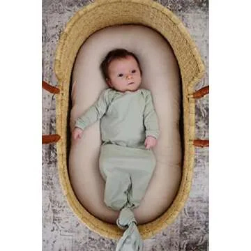Show more Welcome your little one into the world with the Marlowe & Co Organic Cotton Knotted Newborn Baby Gown. Designed for ultimate comfort and convenience, this sleeper gown is made from 100% organic cotton, ensuring a soft, breathable, and gentle touch on your baby's delicate skin. Perfectly crafted for newborns, this knot-style gown features a beautiful mint sage color, ideal for both baby boys and girls. The adjustable knot design allows for easy diaper changes while providing a snug fit that keeps your baby cozy throughout the night. With an emphasis on safety and style, this gown is free from harsh chemicals and is a thoughtful choice for any new parent.