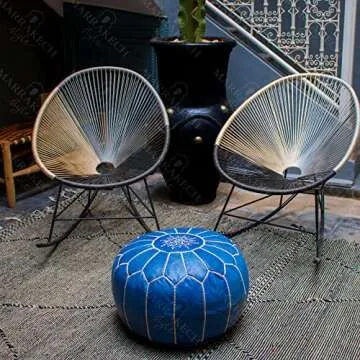 Show more Introducing the stunning Marrakesh Style Comfortable Leather Ottoman Pouf, a perfect blend of style and functionality that graces every corner of your home beautifully! Handmade from 100% authentic goatskin leather, this exquisite blue leather ottoman is designed not just to be a decorative accent but a versatile piece of practical furniture. Whether you need a footrest, additional seating, or a stylish tabletop, this ottoman is an ideal addition that easily complements any decor style. With intricate embroidery on the top, it adds a touch of elegance and richness to your living room, nursery, or bedroom. And don't worry about maintenance – this ottoman is easy to clean with a simple non-abrasive solution and a quick wipe with a microfiber cloth.