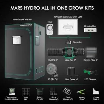 Show more Introducing the MARS HYDRO 4x4 Grow Tent Kit Complete System, the ultimate indoor gardening solution designed for both novice plant enthusiasts and seasoned horticulturists. This comprehensive set comes equipped with everything you need to nurture your plants from seed to harvest, including a cutting-edge 300W TSW2000 high-yield dimmable grow light, a spacious 48" x 48" x 80" grow tent, and a highly efficient 6-inch adjustable ventilation system. The use of top-tier materials, such as 1680D high reflective mylar and a robust metal frame, ensures durability and optimal growing conditions. This is not just a grow tent; it's a dedicated environment tailored for perfect plant growth. Create a thriving sanctuary for your greenery with ease and confidence.