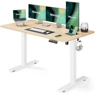 Show more Introducing the Marsail Electric Standing Desk, the ultimate solution for creating a dynamic workspace that not only enhances your productivity but also promotes your health and well-being. This thoughtfully designed desk boasts a generous surface area of 55x24 inches, providing ample space for your computer, dual monitors, and other essential office supplies. With its sleek, modern design complemented by built-in LED lights, this desk effortlessly blends style and functionality, making it a perfect addition to any home or office.