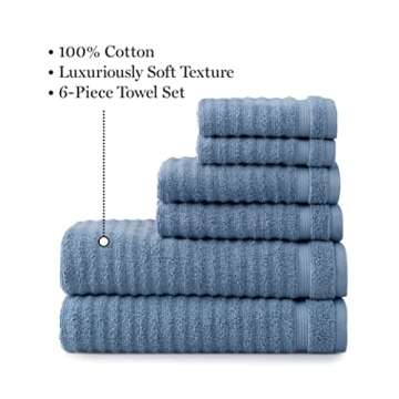 Show more Indulge in the luxurious comfort and style provided by the MARTHA STEWART 100% Cotton Bath Towels Set of 6. This thoughtfully curated collection includes two generous bath towels, two handy hand towels, and two versatile washcloths, each crafted from premium 100% cotton. Designed with both functionality and aesthetics in mind, these towels feature a stunning textured blue design that seamlessly elevates any bathroom décor while ensuring maximum absorbency and softness against your skin. The quick-dry capability makes them a practical choice for busy households, providing you with ultimate convenience without compromising on quality.