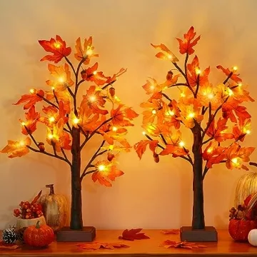 Show more Introducing the MARTINE MALL 2 Pack 23.6'' Fall Lighted Maple Tree—your gateway to creating a beautiful autumn atmosphere in any room. Each set features two exquisite faux maple trees that immediately bring the charm of fall into your home. Standing at an impressive 23.6 inches tall, these trees are adorned with 24 LED lights, 6 delightful pumpkin lights, and 6 decorative acorns, giving them a warm and inviting glow. The plethora of 18 vibrant maple leaves in shades ranging from bright orange to deep crimson enhances the seasonal ambiance, ensuring your space is both cozy and captivating.