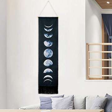 Show moreTransform your living space with the exquisite MARTINE MALL Tapestry Wall Hanging, featuring the enchanting nine phases of the full growth cycle of the moon. Crafted from high-quality cotton linen, this artistic tapestry effortlessly combines elegance and durability, making it an ideal addition to both contemporary and classic decor styles. With its generous dimensions of 12.99 inches wide and 52.75 inches long, it serves as a stunning focal point in any room. Complete with a stylish hanging rod strung with twine, you can easily showcase its beauty anywhere in your home.