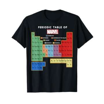 Show moreStep into the world of science and superheroes with the Marvel Ultimate Periodic Table Of Elements Graphic Short Sleeve T-Shirt. This officially licensed Marvel apparel is more than just a stylish tee; it’s a fusion of comic book flair and educational intrigue, perfect for anyone who treasures both Marvel's iconic heroes and the wonders of chemistry. Crafted from lightweight fabric, this classic fit t-shirt ensures all-day comfort whether you’re out saving the day or lounging at home. The double-needle sleeve and bottom hem provide durability that can withstand your adventures, making it a practical choice for your wardrobe.