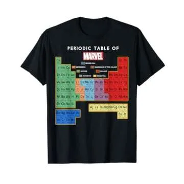 Show more Step into the world of science and superheroes with the Marvel Ultimate Periodic Table Of Elements Graphic Short Sleeve T-Shirt. This officially licensed Marvel apparel is more than just a stylish tee; it’s a fusion of comic book flair and educational intrigue, perfect for anyone who treasures both Marvel's iconic heroes and the wonders of chemistry. Crafted from lightweight fabric, this classic fit t-shirt ensures all-day comfort whether you’re out saving the day or lounging at home. The double-needle sleeve and bottom hem provide durability that can withstand your adventures, making it a practical choice for your wardrobe.