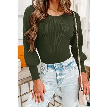 MASCOMODA Long Puff Sleeve Sweaters for Women 2024 Fall Winter Crewneck Knit Ribbed Bodysuit Pullover Tops (Army Green, Small)