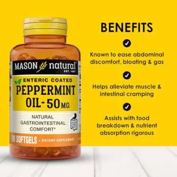 Show moreIntroducing the revolutionary MASON NATURAL Peppermint Oil 50 mg Enteric Coated Softgels, expertly crafted for adults over the age of 18 seeking relief from digestive discomfort. Comprising pure peppermint oil encapsulated in easy-to-swallow softgels, this unique formulation is designed to improve your gastrointestinal health. Just take one softgel daily with meals for optimal results and experience the soothing effects where it matters most. With a strong focus on consumer wellness, Mason Natural has developed this product to tackle issues like abdominal discomfort, bloating, and gas, giving you the digestive support you've been searching for.