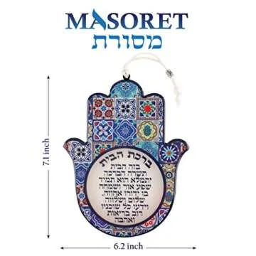 Show moreBring a touch of luck and protection into your home with the MASORET Good Luck Hamsa Hand Wall Hanging Decor. This enchanting piece adorned with rich colors not only serves as a stunning home decor accent but also embodies deep cultural and spiritual significance. Handcrafted in Israel, each Hamsa hand is made of durable wood and finished with a protective epoxy coating, ensuring its beauty and durability for years to come. Measuring at 19 cm x 15 cm (7.4" x 5.8"), it's the perfect size to adorn any wall without overwhelming your decor. The attached cord makes hanging a breeze, allowing you to effortlessly showcase this piece of art in your living space. Celebrate traditional Hebrew blessings while enhancing your home's ambiance with this unique amulet.