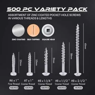 Massca Wood Screws Assortment Kit - Pocket Hole Screws with Plastic Storage Box, 500 Set Screw Assortment Kit Heavy Duty, Fine Thread, Zinc Plated Set Screws for Woodworking, Varying Lengths