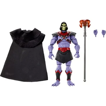 This action figure comes equipped with a variety of accessories, including a soft goods cape, a menacing Havoc Staff, and two sets of swappable hands. These features enhance the playtime experience, allowing fans to recreate or invent their own epic confrontations and displays. The details don’t end there; Skeletor’s belt is elaborately bat-encrusted, and a removable chest harness flaunts striking skull and crossbones embellishments, showcasing the character's villainous flair.