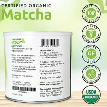 Show moreDiscover the exquisite taste and remarkable benefits of the MATCHA DNA Organic Green Tea Powder. Packaged in a generous 16 oz tin, this remarkable tea is not just a delightful beverage; it's a journey into wellness. Rich in antioxidants, vitamins, and minerals, this matcha is perfect for health enthusiasts seeking a delicious and nutritious drink. As a proud USDA Certified Organic product, MATCHA DNA guarantees that you receive only the highest quality matcha, free from harmful additives and chemicals. Our organic tea undergoes rigorous testing for purity and is certified without BPA in its packaging, ensuring that your tea experience is as safe as it is satisfying.