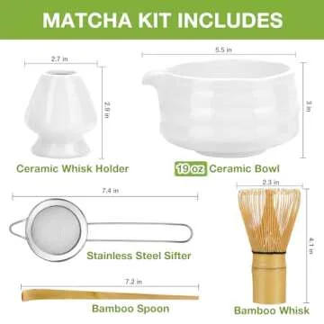 Show more Experience the art of preparing and enjoying matcha tea with our elegant 5-piece Matcha Whisk Set. This set comprises essential tools that make every matcha moment unforgettable: a handcrafted bamboo whisk, a precision bamboo scoop, a stainless steel sifter, a beautifully designed ceramic matcha bowl, and a whisk holder. Each piece is thoughtfully crafted, providing both functionality and aesthetic appeal, ensuring that whether you're a seasoned enthusiast or just starting your journey, you receive the best matcha experience in the comfort of your own home.