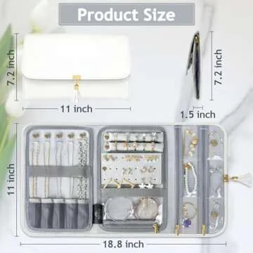 Show moreIntroducing the MATEIN Jewelry Travel Case - the ultimate travel companion for all jewelry lovers! This beautifully crafted travel jewelry organizer is designed to keep your favorite pieces safe and organized wherever life takes you. With a roomy capacity that includes five distinct compartments, it’s perfect for rings, earrings, necklaces, and more, ensuring that every piece has its own special place. When folded, it measures a compact 11''L x 7.2''W, but unfolds to a generous 18.8''L x 11''W for easy access while you’re on the go, making it ideal for any travel adventure.