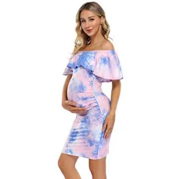 Maternity Outfits Women's Maternity Dress Off Shoulder Casual Maxi Dress Rainbow Maternity Dress (XL,Pink&Blue01)
