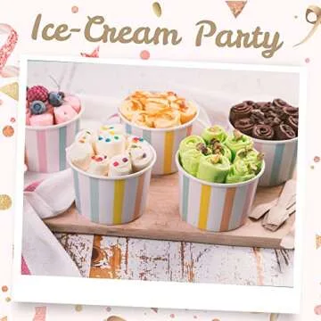 Show more Experience the joy of serving delicious treats with our exquisite Bulk Paper Treat Cups. Designed for versatility and style, these vibrant pastel-striped paper cups are perfect for ice cream shops, concession stands, caterers, and even home parties. Each pack includes 50 cups, making it an ideal choice for large gatherings, kids' birthday parties, or charming baby showers. Their charming design is sure to add a touch of flair to any event.