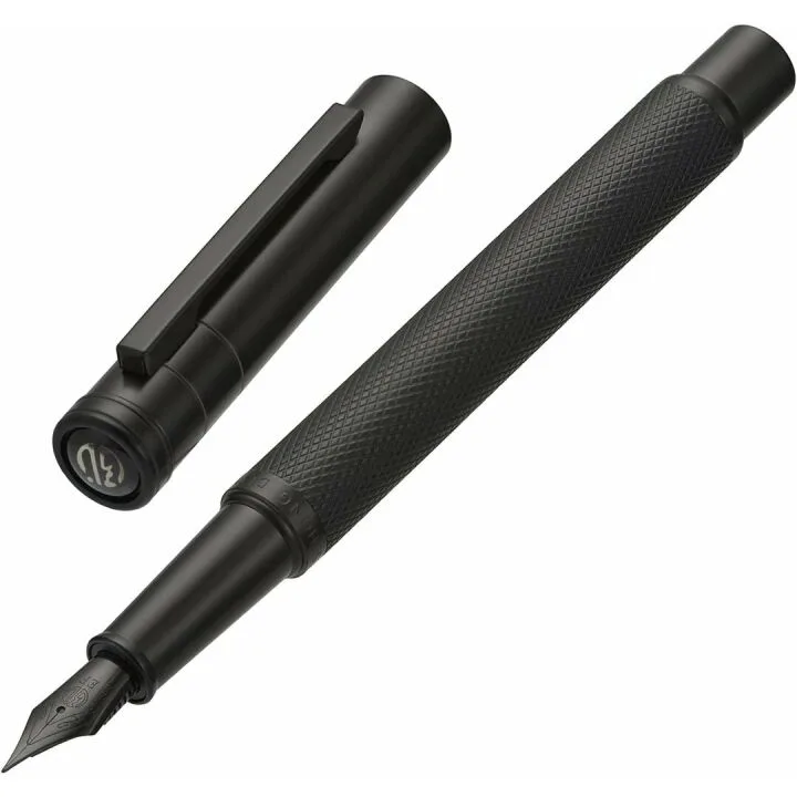 The pen has a sleek matte black finish, an extra fine nib, a durable metal body, a converter for ink filling, and comes in an elegant metal pen box.