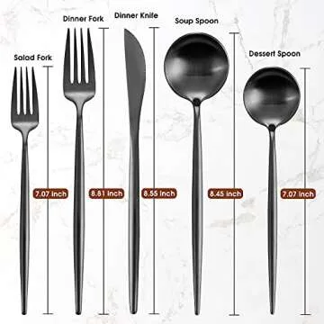 Crafted with exquisite workmanship, this silverware set features smooth surfaces and finely-tuned edges that provide both comfort and style. The matte black finish gives each utensil a sophisticated look that harmonizes beautifully with any dinnerware. For added functionality, these stainless steel utensils resist corrosion, warping, and flexing, ensuring long-lasting durability while maintaining a perfect weight that feels both luxurious and balanced in the hand.