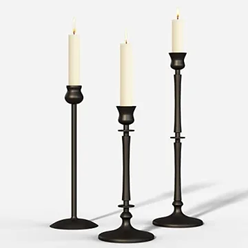 Show more The perfect addition to your home décor, this stunning set of tapered candle holders is designed to impress. Crafted with care, these matte black candle holders accommodate standard tapered base candles measuring 7/8 inch in diameter. The set includes three beautifully varied heights of 13.5, 11, and 9.5 inches, offering an elegant display whether they are adorning your mantle, dining table, or any farmhouse-inspired décor.