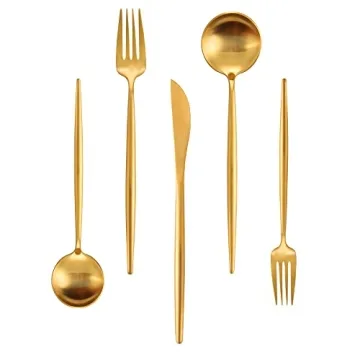 Elevate your dining experience with the Matte Gold Silverware Set for 4 from IBIILII JEFF. This 20-piece stainless steel flatware set is designed for those who appreciate the refined elegance of modern dining. Each set includes 4 salad forks, 4 dinner forks, 4 dinner knives, 4 soup spoons, and 4 dessert spoons, perfectly complementing any meal, from casual breakfasts to formal dinner parties. The sophisticated matte gold finish not only enhances its beauty but also reinforces...