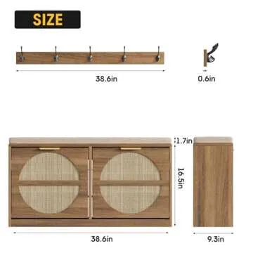 Maupvit Rattan Entryway Bench with Seat Cushion & Coat Rack, Shoe Storage Cabinet with 2 Flip Drawers, Narrow Shoe Rack, 5 Sturdy Metal Hooks, Rustic Oak Rattan